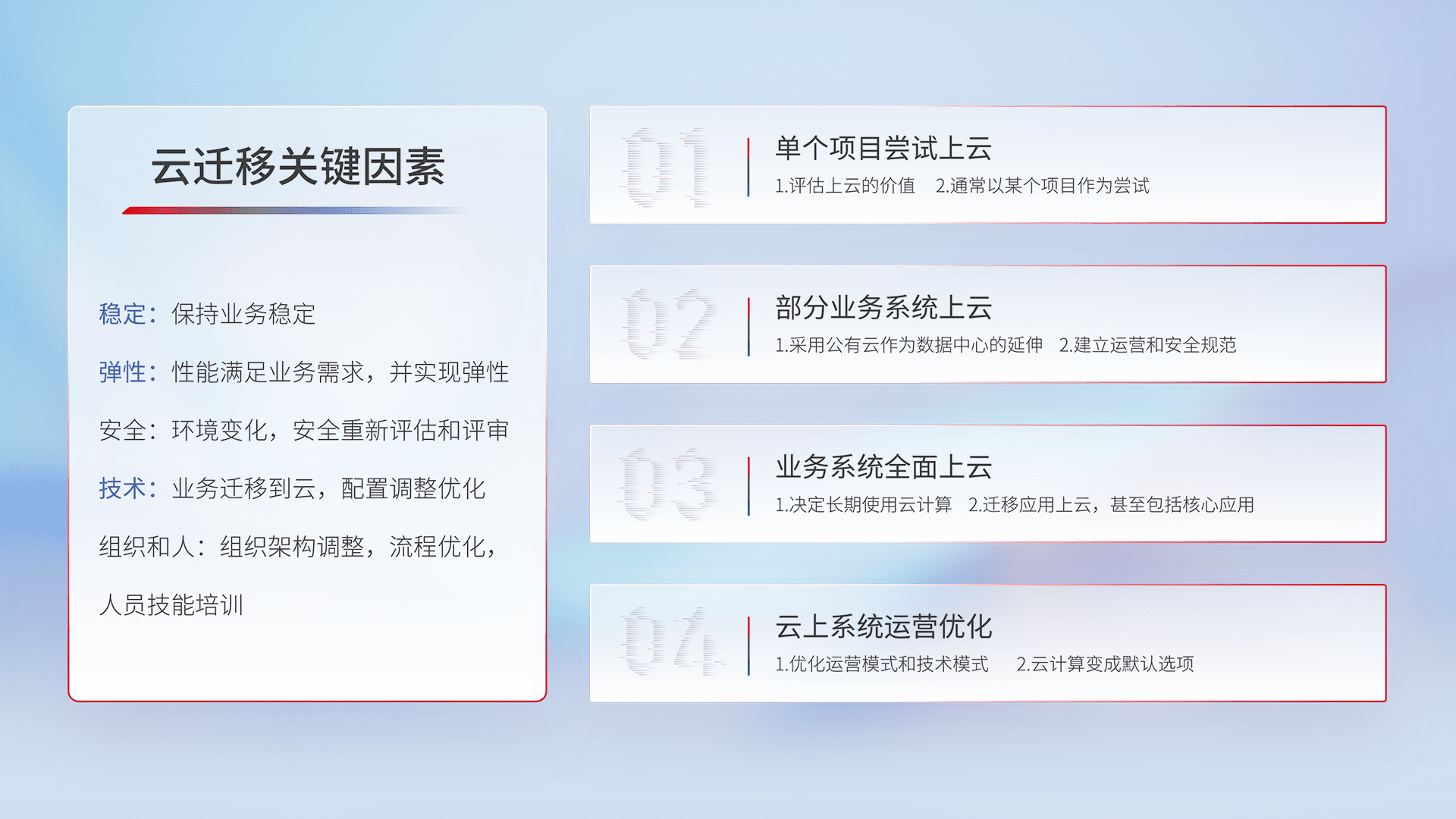 结合实际业务,,,从规划设计、、云平台选型、、、、云原生改造、、、数据迁移、、、集成交付,,,迁移全过程为客户识别最佳上云路径,,,做好风险识别管理,,,设计网络架构、、、、身份权限、、、安全审计合规、、操作审计、、、日志审计、、监控告警策略、、多站点容灾设计等,,,对云上基础设施进行整体规划,,提升IT治理水平,,,,以满足弹性、、、高可用、、高性能的需求。。